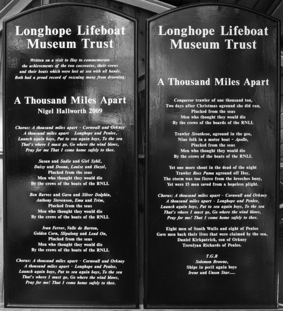 As part of the commemoration of 50 years since the Longhope Lifeboat Disaster, the local choir sang A Thousand Miles Apart, a song that links the crews and families of those in Longhope and Penlee in Cornwall, who faced their own tragedy in December 1981 when their lifeboat Solomon Browne was lost with all hands.