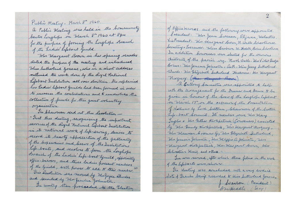 On March 8 1960 a public meeting was held for the purpose of forming the Longhope Branch of the Ladies Lifeboat Guild. The first President elected was Mrs Jean Swanson, of Oljaren, Melsetter.